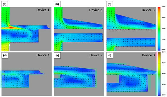 Velocity magnitude contour and vectors of sampling devices. (a–c) show cross-sectional view of the center of the devices. (d–f) show cross-sectional view at the half point from the center to edge.
