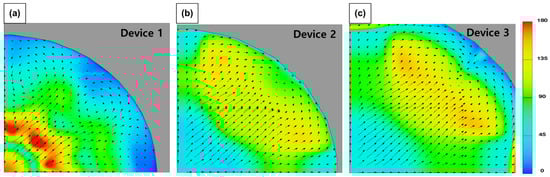 Velocity magnitude vectors on the surface of filter: (a) Device 1, (b) Device 2, and (c) Device 3.