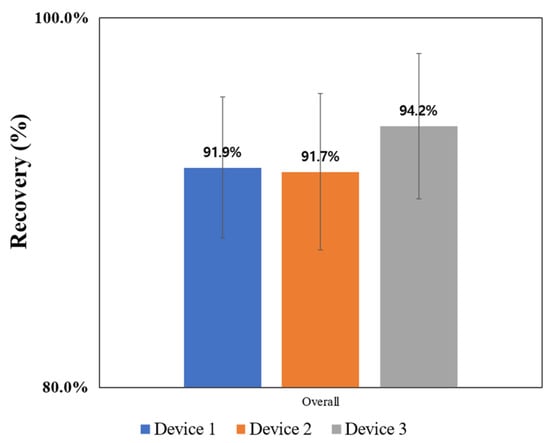 The final recovery rate of Device 3 was 94.2%, and the overall recovery rate of microplastics showed an increasing trend as the device improved (Figure 10). In the case of Device 3, a recovery rate of over 90% was confirmed for all plastics. A comparison of recovery rates found in previous studies that used the same encapsuled method is shown in Table 6. The developed device had the highest recovery rate. This rate increased when the loss in the device where the sample comes into contact with CFD was confirmed and improved.