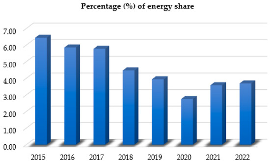 Figure 7. It can be seen that the total power generation capacity of Bangladesh has been gradually increasing since 2015, along with the renewable energy capacity. In order to achieve the sustainable capacity of renewable fuels in Bangladesh in SDG implementation, it was more than six percent in 2015 alone. As such, the target adopted by Bangladesh was about 3.69 percent. No progress has been made in meeting the remaining targets in the following three years, resulting in a gradual decline from 2017 to 2020 to 3.94 percent.