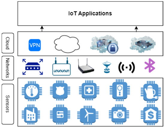 The fundamental IoT technologies and architectural framework are shown in Figure 3. The framework combines numerous layers, with the first layer containing sensors and objectives utilized in diverse domains, such as hospitals, banks, factories, government offices, agriculture, etc. These sensors are connected to several network technologies, including optical fibre, ethernet, 4G/5G, LTE, Wi-Fi, ZigBee, and Lora [19]. The cloud storage solution provides scalable and cost-effective storage for network-collected data. The upper layer is viewed via numerous IoT applications consumers utilise to enhance security and efficiency.