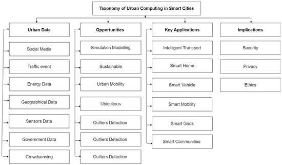 In this section, we devise a taxonomy of urban computing in smart cities based on various categories. These categories demonstrate the interrelation between the urban computing concept and smart cities. Figure 4 shows a number of parameters extracted from the literature: urban data, opportunities, key applications, and implications.