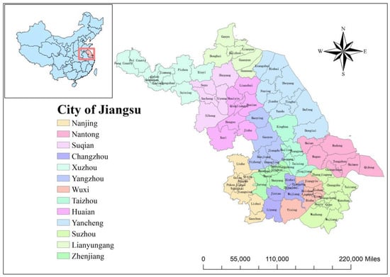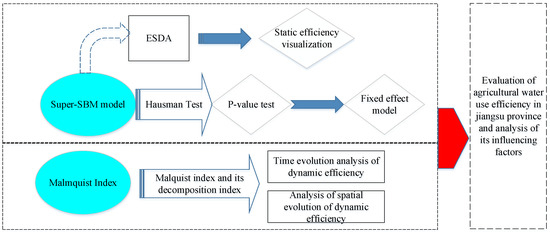 There is a wealth of academic research on agricultural water use efficiency and the existing literature on agricultural water use efficiency focuses on three main areas: efficiency measurement, identification of influencing factors and spatial variation. There are three main approaches to measuring agricultural water use efficiency: single factor efficiency assessment and full factor efficiency assessment, which is more realistic in that full factor efficiency considers not only water-resource-related variables but also inputs from other factors. The most common method used to evaluate full factor efficiency is Data Envelopment Analysis (DEA). Shang et al. used the Super-Slacks-Based Measure (SBM) model and the Malmquist index decomposition method to analyse panel data from 2009 to 2018 for major grain producing regions in China to analyse the impact of technological progress on agricultural water use efficiency [1]; Azad et al. [2] proposed measuring agricultural water use efficiency from an environmental perspective with the help of the Luenberger model for 17 of the Murray–Darling Basin in Australia Azad et al. [2]. The model is a guide to developing regional policies and strategies to achieve sustainable water use in the agricultural sector based on efficiency values. Lu Weinan et al. [3] measured and analysed agricultural water use efficiency in the Yellow River Basin and found a gradual upward trend in agricultural efficiency over the period examined. With the development of efficiency assessment models, models such as SBM Unsighed [4] and Super SBM Unsighed [5] have been developed. To deepen the study of water resource use efficiency, exploratory spatial data analysis [6,7,8], the Gini coefficient [9,10] and Thiel’s index [11,12,13,14] were used, such as Wang Chun et al. [15], who combined spatial autocorrelation analysis with the Super SBM model to analyse the agricultural water resource use rate of provinces, cities and autonomous regions in China. Ying Han et al. [16] and others used the ESDA method to explore the agricultural water use efficiency of 218 prefecture-level cities in China from 2003 to 2018. Yu Liu et al. [17] analysed the spatial differences in agricultural water use efficiency of 52 cities in northwest China from 2000 to 2018 and explored the factors affecting agricultural water use efficiency with the help of a spatial econometric model. This paper examines the changing trends of agricultural water use efficiency in Jiangsu Province from the spatial and temporal dimensions. Based on the complexity of the factors influencing agricultural water use efficiency and regional location differences, we selected suitable regression models to find the influencing factors of water use efficiency and to determine the correlation and degree of influence between the influencing factors and agricultural water use efficiency. Common regression models include the Tobit model [18,19,20], the spatial Durbin model [21,22,23] and the spatial autocorrelation regression model [24,25].
