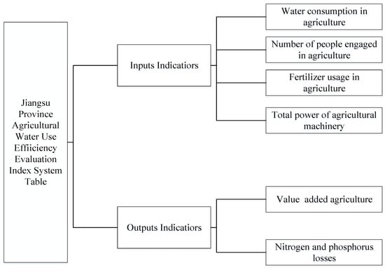 In order to make Jiangsu’s agricultural water efficiency evaluation index system more reasonable, the principles considered to develop the DEA technique are expressed as (i) systematic, each indicator has a certain degree of relevance to each other and can reflect the characteristics of the research subject from different perspectives; (ii) clarity, the indicators should be chosen with clear concepts and definitions, so that data can be collected easily and the indicators should not be overly detailed or redundant; (iii) quantifiable, the indicators should be selected in such a way that they can be calculated and measured in a consistent way for the purpose of evaluation and countermeasure provision; (iv) scientific, the selection of indicators for each dimension should reflect the scientific nature, be representative and reflect the characteristics of the research area, and the quantification of indicators must be based on scientific criteria.