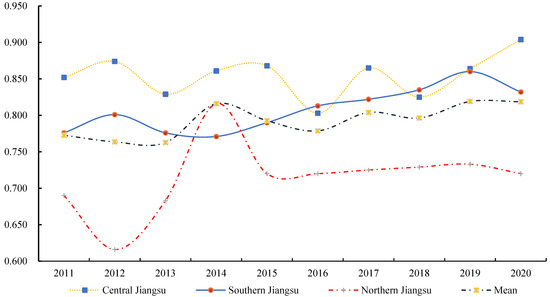 Overall, the efficiency of agricultural water use in Jiangsu Province from 2011 to 2020 is less than 1, indicating that agricultural water use in Jiangsu Province is inefficient and there is still more room for improvement from the effective frontier. The efficiency level of each city is gradually improving, but, by 2020, the efficiency of agricultural water use in Jiangsu Province will be effective in only two cities, Nanjing and Nantong, indicating that the efficiency of agricultural water use in other cities in Jiangsu Province is low. By region, agricultural water use efficiency in central and southern Jiangsu is generally higher than the provincial average, except for 2014, when it was lower than the provincial average; in northern Jiangsu, there is still more room for improvement than the provincial average. Except for Yancheng, which was in relatively good shape during the study period, Suqian’s overall efficiency was below 0.6; Huai’an and Lianyungang’s overall efficiency was below 0.7; and Xuzhou’s agricultural water use efficiency was slightly above 0.7. In southern Jiangsu, the overall efficiency of agricultural water use in the region is slowly increasing year by year, with Changzhou and Suzhou experiencing large fluctuations in agricultural water use efficiency, resulting in a decline in the region’s agricultural water use efficiency in 2020. This is mainly due to the increased use of agricultural fertilizers in Nantong in 2012 and the decrease in agricultural value added in the same year. The agricultural water use efficiency in central Jiangsu started at a high level of 0.852 during the study period and has since shown a “W”-shaped trend, fluctuating more frequently, with agricultural water use fluctuating from high to low and a certain amount of wasteful agricultural water use, but it has always been at the highest level of agricultural water use efficiency in the province. As other cities in Jiangsu Province are unable to improve their agricultural water use efficiency with the help of the radiation of Nanjing and Nantong, the agricultural water use efficiency in Jiangsu Province is only 0.782.