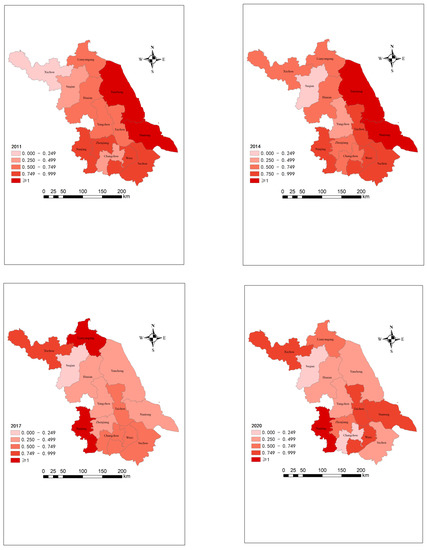 Spatial distribution pattern of agricultural water use efficiency in Jiangsu Province in 2011, 2014, 2017 and 2020.