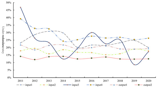 As can be seen from Table 3, there are cities in each year that are inefficient in agricultural water use (Super-SBM model efficiency values less than 1, indicating that there are varying degrees of slack in the input and output elements of agricultural water use efficiency in each city in Jiangsu Province, leading to a loss of agricultural water use efficiency and resulting in inefficient agricultural water use. In order to explore the causes of inefficient agricultural water use in each municipality, the input redundancy rate and output deficiency rate were measured, and the input and output factors were then adjusted to improve agricultural water use efficiency. Figure 6 shows the annual average values of input redundancy and output deficiency rates for agricultural water use in Jiangsu, where the input redundancy rates for total agricultural machinery power and agricultural water use are higher than other input and output indicators, which is an important cause of inefficient agricultural water use in Jiangsu. From the above analysis, it is clear that attention should be focused on the actual demand for total agricultural machinery power in agricultural production in each municipality in Jiangsu Province, and agricultural owners are advised to arrange the amount of agricultural machinery used according to actual conditions. A quantitative analysis of water demand in agricultural production should be carried out to strengthen agricultural producers’ awareness of water conservation. The use of fertilizers in agriculture has fallen to a low level at the end of the study, but the future trend of change is unknown, as fertilizer use is the main material source of pollution of agricultural water resources and land resources. Therefore, in the context of today’s ecological and environmental protection, it is particularly important that fertilizer use is managed in the course of future agricultural production activities in Jiangsu and that technical guidance on agricultural production is provided to conserve water and use agricultural fertilizers scientifically while ensuring yields.