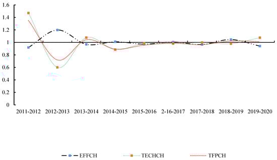 The agricultural water efficiency change index can be further decomposed into an index of technical efficiency change (EFFCH) and an index of technological progress (TECHCH), from which the relationship between efficiency changes can be seen as follows:
