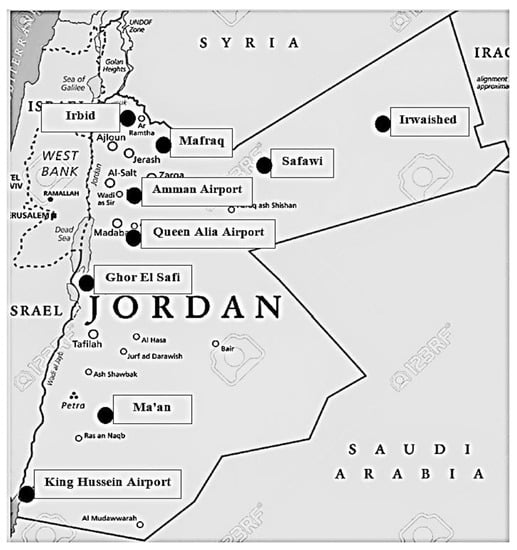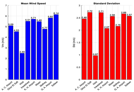 The wind data should be assembled from the nearest meteorological stations to the potential wind site in order to perform an accurate wind resource evaluation. Such information is typically collected at 10 m above ground level and can be extrapolated to a higher altitude (usually the turbine’s installation height). This gives a precise evaluation of the wind for big wind projects. Key wind statistics, such as average wind speed and direction, may be categorized into 10 min, hourly, daily, monthly, and annual time intervals. The most typical time scale, a 10 min basis, can offer enough resolution to provide an accurate wind potential estimation [3,49,50,51,52]. Jordan is divided geographically into three main regions: Jordan Valley region, Western Highlands Range, and the Desert Regions. Jordan Valley is a narrow region along the western strip considered a low-lying agricultural land that can reach up to 400 m below sea level; thus, it is a poor region in terms of wind energy resources. Western Highlands Range is a mountain range along Jordan’s western facade representing an encouraging environment for investment in wind energy projects, as well as the Desert Regions which are vast areas including the eastern and southern parts of Jordan [31,38,39,40]. The wind data were collected and recorded for this study, at a height of 10 m above ground, from nine wind stations in Jordan: Queen Alia Airport, Civil Amman Airport, King Hussein Airport, Irbid, Mafraq, Ma’an, Ghor El-Safi, Safawi, and Irwaished. The geographical distribution of these sites across Jordan is depicted in Figure 1. In this work, the wind data were collected for a one-year period, sufficiently representing all the year’s seasons. The geographic position of the meteorological stations at these sites are shown in Table 2. Additionally, Table 1 includes the wind data time spans, data sampling rate, and the number of obtained data for each wind station.