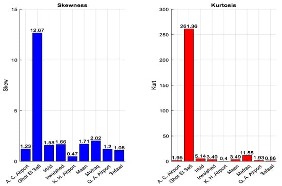 The direct statistical analysis of wind speed data to find the mean value and standard deviation are illustrated in Figure 2. This chart demonstrates that the average wind speed at all sites was roughly 5 m/s. A deeper look at this data reveals that the average wind speed for all sites ranged between 2.5 m/s and slightly above 6 m/s. The minimum standard deviation regarding wind speed data across all locations was approximately 1 m/s in Irbid, while the maximum values are around 2.7 m/s in Ghor El-Safi. The distribution patterns of wind data are illustrated in Figure 3. Wind data skewness was positive at all locations. Ghor El-Safi had the highest skewness value for wind speed data, with a value of about 12.5. This result shows that its distribution curve had a noticeable asymmetry. The smallest kurtosis values were found at King Hussein Airport and Safawi, with a value of less than one for both sites. Remarkably, Ghor El-Safi had the highest kurtosis value compared to the other sites, indicating a significant difference. The distribution curve for this site was very steep compared to the typical distribution as a result.