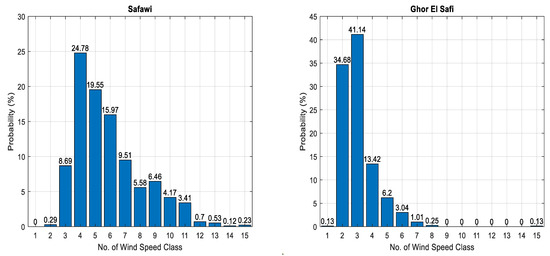 The wind speed was split across many divisions in order to be organized. Each division had a speed interval of 1 m/s. The observed probability of each class was calculated for all sites, as shown in Table 3. A closer inspection of this table shows that class (3) recorded the highest probability value in five wind sites, followed by class (4) with two wind sites. The highest probability values achieved by classes (2) and (3) were in the Irbid wind site with around 84%. This indicates that the prevailing wind speed in the Irbid site is within these classes, which is considered as low wind speeds. The same observation was made for the Ghor El-Safi wind site. It is clear from Table 3 that the classes of (11) and above recorded the lowest probability values in all wind sites, as they did not exceed 5% (see the Safawi wind site). Figure 4 represents the histograms of the observed probabilities for two wind sites, one was classified as richly endowed with wind resources (Safawi site) while the other was a resource-poor site, such as Ghor El Safi, according to Table 2 and Figure 2 and Figure 3. In general, the data shown in Table 2 and Table 3 show significant disparities in the features and specifications of the proposed wind sites. This was due to the differences in geography between these areas.