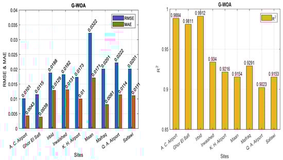 RMSE and MAE (left) and R2 (right) values of best model (G-WOA).