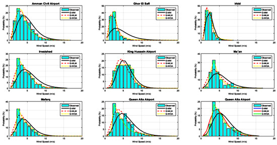 In this study, two numerical estimating methods (MM and MLM) and one artificial intelligent optimization (WOA) were used to estimate the parameter values for all indicated models, i.e., Weibull, Rayleigh, and Gamma, for the prospective wind sites. As was already indicated, the goal of this study was to minimize the error between the likelihood of the observed wind speed and the estimated values while also maximizing the estimated energy of the wind regime. The accuracy of the anticipated wind speed in comparison to the measured values offered by Taqs Alarab Weather Forecasting Company were tested using three different performance indicators. The estimated parameters and accuracy indicators for each approach are listed in Table 5. Generally, the WOA method outperformed the traditional methods (MM and MLM) in all sites based on all indicators results; therefore, this supports the fact that artificial intelligent methods are better than traditional methods. Specifically, the Gamma model employing the whale optimization algorithm (G-WOA) achieved the best results among other models (W-WOA and R-WOA), according to RMSE, R2, and MAE outcomes. Amman Civil Airport had the lowest RMSE value, which was 0.01013, while the worst value recorded by Ma’an with 0.03222. The findings of the RMSE test, which demonstrated the dominance of G-WOA over the other approaches, were supported by the MAE test values. A closer look at the accuracy analysis results revealed that for all wind sites, values greater than 0.9 for the results generated by R2 techniques imply that the observations and the expected PDFs were very consistent. In contrast to other wind locations, where the accuracy of the Weibull model employing the whale optimization algorithm (W-WOA) was the superlative model and the indicator values of the RMSE, R2, and MAE tests were, respectively, 0.0176, 0.934, and 0.0093, the results for King Hussein Airport were different. In Figure 7, the accuracy indicator results of the best model (G-WOA) are represented graphically. Figure 8 represents the probability distribution function (PDF) and the observation histograms for each site. These graphs confirm that G-WOA offered the best fit. In comparison to the other methods, the figure generally showed that the PDFs associated with the G-WOA method matched the observed data histograms efficiently.
