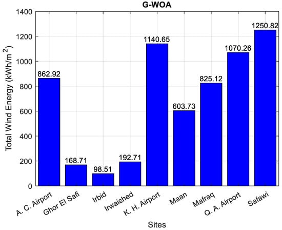 Table 6 summarizes the entire scenarios of wind energy outcomes for wind regime in all sites. It is noteworthy that the total wind energy calculated by WOA models were greater than the MM and MLM related models; this was because of the optimal performance of WOA according to accuracy indicators. Figure 9 illustrates the total available wind energy based on the G-WOA model. As can be seen from the figure, the Safawi and King Hussein Airport wind sites both produced high total wind energy values with 1250.82 kWh/m2 and 1140.65 kWh/m2, respectively. On the other hand, Irbid and Ghor El-Safi obtained the lowest energy values with 98.51 kWh/m2 and 168.71 kWh/m2, respectively. The mean value and the distribution of wind speeds, effectively, affected the outcomes of energy assessment. It is clear that if the mean value was high and the distribution of wind was closer to symmetry (i.e., skewness and kurtosis approach to zero), the amount of extracted energy from wind regime was high and vice versa. Both the Safawi and Irbid cases support this claim, evidently.