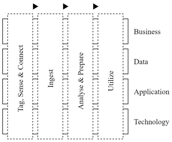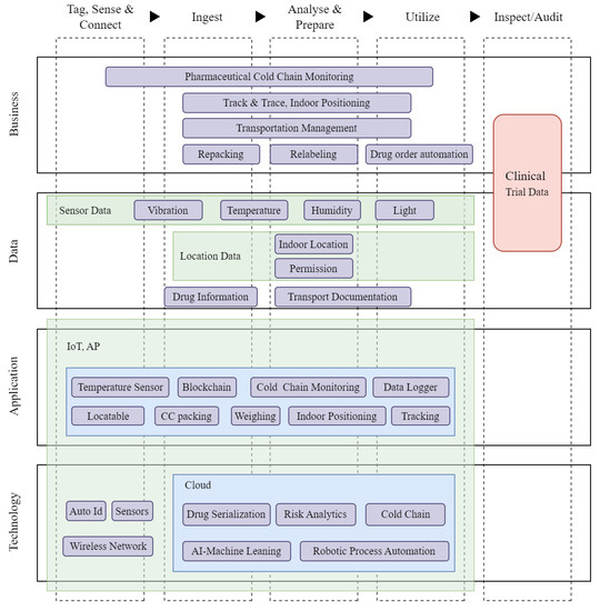 A reference architecture (RA) is a document or set of documents that provides recommended structures and integrations of IT products and services to create a solution for pharmaceutical cold chain digital transformation [15]. The RA embodies accepted pharmaceutical cold chain industry best practices, typically suggesting the optimal delivery method for specific technologies. RA offers IT best practices in an easy-to-understand format that guides the implementation of complex technology solutions. In the realm of business, the idea of RA is new. RA is commonly used by many architects involved in developing complex systems. Enterprise architectures (EAs) are specific to companies, while RAs specific to industries are two levels of architectures that distinguish [49]. RA is a template for a technology solution that is created for a particular sector or function [50] and captures both business- and technology-facing viewpoints [49,51]. RAs give an industry’s processes, stakeholders, and organizational, informational, and technological structure at a high level and organized fashion [50]. To preserve consistency, establish a single language, and increase efficiency in technology development internally and externally, RAs are crucial [51]. This work demonstrates how a generic RA model, presented in several industry forums [15,52], can be used to characterize the deployment of many cutting-edge digital transformation technologies in the pharmaceutical sector, which are shown in detail. The generic digitalization references the architecture’s significant components, which are architectural domains, digitalization stages, and pharma industry perspectives. Figure 2 presents a graphical representation of the fundamental structure of the digitalization RA. The basis for defining the RA domains is one of the most frequently used open frameworks: TOGAF, maintained by the Open Group consortium for reference architecture design. The vertical TOGAF domains slice depicts the business, data, application, and technology layer of the RA for pharma digitalization. The RA recognizes that digitalization is horizontally divisible into four sequentially arranged digitalization process stages: Tag, Sense, and Connect; Ingest; Analyze and Prepare; and Utilize. Halpin et al. think that to digitalize pharmaceutical items and procedures, pharma IoT refers to the use of intelligent-linked gadgets and IT resources like the internet, smartphones, applications, etc., in medical innovation, medical testing, distribution networks, and patient care [53,54].