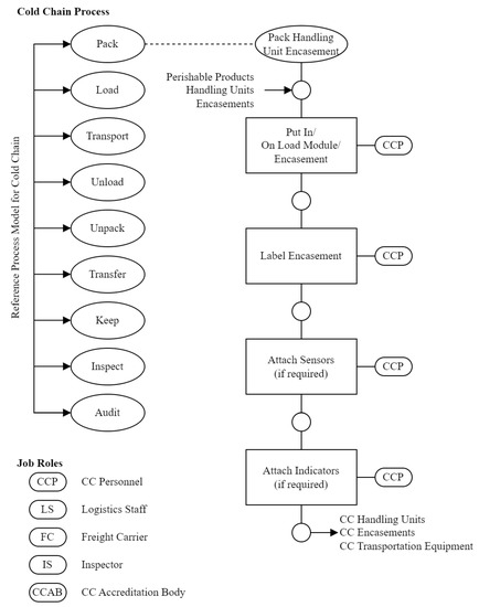A reference process model (RPM) is a model comprising definitions of processes described in terms of pharmaceutical cold chain process purpose and outcomes. Together, with an architecture, it describes the relationships between the cold chain processes [4]. Using the RPM in a practical application may require additional elements suited to the environment and circumstances [45]. Cold chain conceptual pieces combined from a literature review are then added to the static view (object model) of the reference process model using an object-oriented modeling methodology. The dynamic attributes of the reference process model that represent the business process view are also described. In modern supply chain systems, according to the approach of [46], the cold chain reference model adds the corporate action and delivers through the cold chain as an alternative to the standard delivery procedure. A collection of RPM components consists of eight activities, which are sufficient to depict the cold chain flow of pharmaceutical products such as packing perishable products into handling units/encasements, loading and handling units/encasements onto transportation equipment, transporting handling units/encasements between two locations, unloading handling units/encasements from transportation equipment, unpacking perishable products from encasements/handling units, transferring handling units/encasements within a location, and storing perishable products/handling units. Multi-stage cold chains can be created using several cold chain connections [47,48]. Object-oriented modeling classes are usually described by their name, attributes, job role, and services. In this first version of an RPM primarily intended for discussion, attributes and services are not displayed to avoid overcomplicating matters. On the other hand, some of the essential services are already apparent since they match process elements.