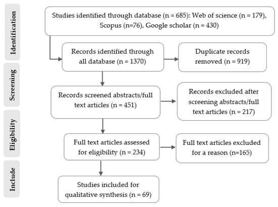 The initial search for relevant articles resulted in 1370 articles. After eliminating duplicates (919 articles), the search criteria yielded 451 articles across all databases. The titles, abstracts, and keywords of 451 articles were screened, with 217 excluded. Critical appraisal of the 234 studies that met the relevance criteria led to the exclusion of 165 studies due to low or unclear validity. Consequently, 69 studies showing the response of carabid beetles to different management practices in agroecosystems were used for the qualitative synthesis. The search, screening, and inclusion of studies are schematically summarized in the flow chart below (Figure 1).