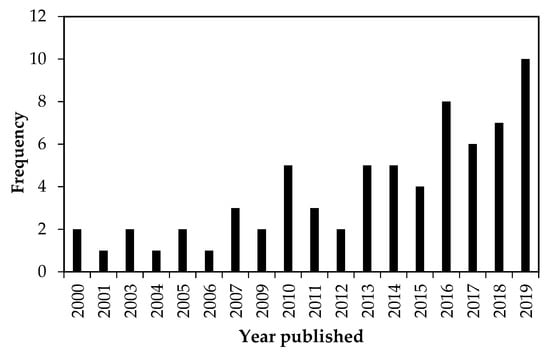 According to the systematic review, the first papers addressing the response of carabid beetles to agricultural management were published from 2000 to 2009, with no articles found in 2002. Since then, the temporal trend of studies dealing with this topic has shown a steadily increasing rate, indicating that it is an emerging field of research. This was found when 55 articles were published between 2010 and 2019, respectively (Figure 2). Overall, the selected papers show that most of the studies were conducted mainly in developed countries, particularly in Germany (n = 19), France (n = 11), the United Kingdom (n = 7), and the United States (n = 5), while few studies were conducted in developing countries in Southern Africa (n = 6) and East Asia (n = 4), (Figure 3). In terms of agricultural management systems, conventional farming predominated in 28% of studies, followed by diversified farming systems (17%), integrated agriculture (16%) and semi-natural habitats (16%). Only a few studies were conducted on organic farming (13%) and conservation agriculture (10%) (Table 2; Figure 4a).