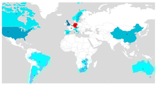 Geographic locations of the 69 included peer-reviewed studies on the word map.