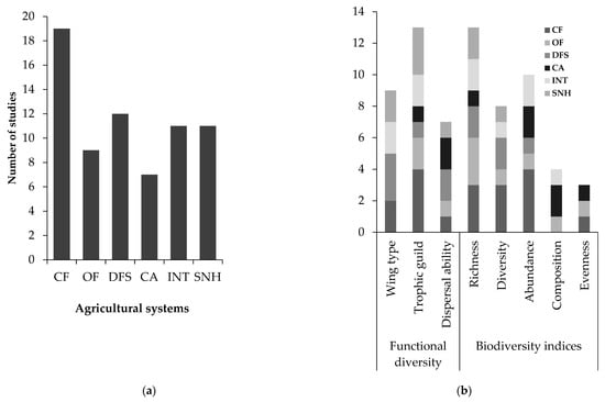 Summary of number of papers published on (a) agricultural management type and (b) carabid functional diversity and biodiversity indices included in the systematic review (see Table 2 for abbreviations).