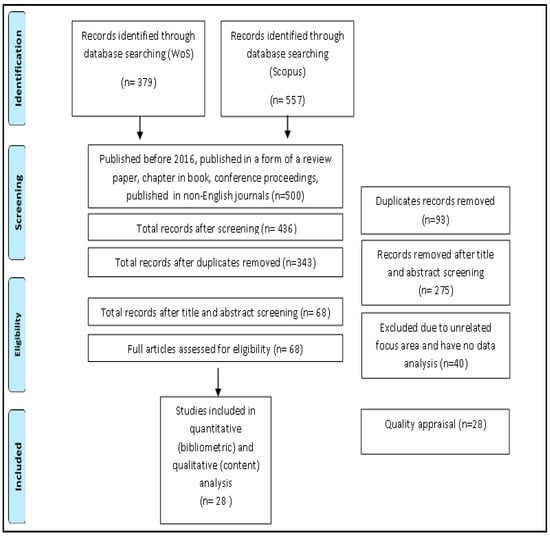 Initially, 936 publications were retrieved from 2016 to May 2021 across the two selected databases, of which 379 were from WoS and 557 articles were from Scopus. All retrieved articles were recorded in an Excel sheet to screen for duplicated materials before exporting them to the “Mendeley“ software for article management purposes.