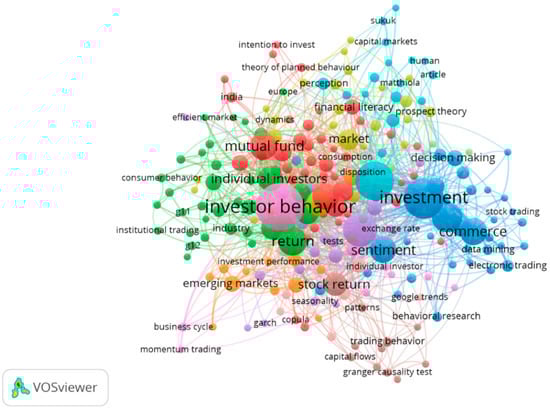 Using the VOSviewer application [61], as illustrated in Figure 2, we discovered that investor behavior, stock market, investment, financial market, commerce, and behavioral finance were frequently associated with investors’ behavioral intention and decision making. The color, circle size, font size, and thickness of connecting lines represented the relationships with other keywords. The keywords mirrored the main themes and sub-themes identified throughout the systematic literature review procedure.