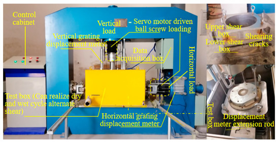 The soil samples collected in the field were air-dried and sieved in the experiment. The soil material was weighed according to the particle gradation of round gravel soil after scale reduction and mixed evenly after spraying an appropriate amount of water according to the natural moisture content of 13.1%, divided into three parts equally, and loaded into the bogging bucket, enclosing for 24 h. Control the wet density of round gravel soil to 1.97 g/cm3, the sample was loaded and compacted in layers, the inter-layer hair scraping treatment was required, and strictly control the filling density of the sample. For the direct shear experiment of round gravel soil under saturated conditions, after filling samples, water was added to the test chamber to cover the shear box, and the shear test shall be conducted after 24 h saturation. The experimental loading was strain-controlled, and the straight shear test was performed by fast shear, as shown in Figure 5.