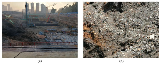 The experimental soil sample was selected from the round gravel soil of the foundation pit project of fourteen water quality purification plants in Panlong District, Kunming, at a depth of 14 m. The lithology of the stratum is alluvial round gravel, dark gray, blue, saturated, slightly dense mainly, and locally medium dense, and the photo of the sampling point is shown in Figure 2.