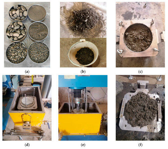 Experimental steps for direct shear of round gravel soil: (a) sieving soil; (b) soil mixing and enclosing; (c) load soil sample into shear box; (d) lift the shear box into the test chamber; (e) install the sensor and start the experiment; (f) observe the shape of the cutting surface.