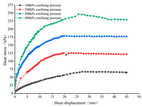 Figure 6 shows the round gravel soil’s fast shear stress-shear displacement curves in the natural water content state. As can be seen from the figure, the shear stress of the round gravel soil of the 14th water purification plant of Kunming City increases with the increase of shear displacement and then tends to be stable or decreases to a smaller extent, with the peak shear value appearing between 30% and 45% of the shear displacement. It can be seen that the curve jumps at some points, mainly since the initial density of the sample is small, and the shrinkage is continuous during shearing, resulting in the increase of compactness and strength and the increase of shear stress. Due to large interlocking particles of gravel in the sample, the overturning friction between the large particles of gravel requires a large horizontal thrust as the shearing proceeds, resulting in a rapid rise of shear stress. After the overturning, since the overturning friction resistance between coarse and fine grains is small, the shear stress decreases slightly while the shear plane is still in a tight state, and the shear stress continues to increase until reaching the peak. Low load specimen shear stress with the increase in shear displacement always maintains an increasing trend. With the increase in vertical load, this trend gradually weakened, combined with the end of the experiment shear surface. The difference in the distribution of large particles near the shear plane may cause this. The shear stress is high if there are many large particles in the shear plane.