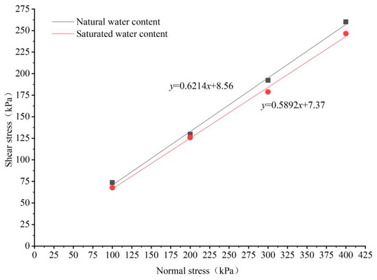 From Figure 8, it can be seen that the cohesion and internal friction angle of the saturated moisture content of the round gravel soil are smaller than those of the natural moisture content, which is since the water content of the saturated round gravel soil is larger than that of the natural state. The lubricating effect of the free water on the surface of the soil particles is enhanced, resulting in the weakening of the occlusal force between the particles and the weakening of the frictional effect, and the smaller horizontal thrust can make the soil produce larger shear displacement. The strength parameters of the round gravel soil in the natural and saturated state are shown in Table 3 from Figure 8.