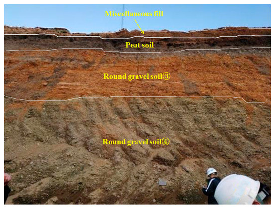 Plateau alluvial strata are formed by the joint action of river alluvium and lake marsh sedimentation. Generally, they consist of rounded gravels with high foundation strength and are often used for urban construction sites [1,2,3,4,5]. Influenced by geological activities on the Yunnan-Guizhou Plateau, rounded gravel strata are widely distributed in Kunming [6] and buried at a shallow depth. Influenced by the formation conditions, time, and geographical area of round gravel soil, the maximum particle size of round gravel soil reaches 60–80 mm, and the poor grading, strong permeability, and interparticle clay composition lead to the strength of round gravel soil are larger than general soil [7,8,9,10,11,12]. To a certain extent, these characteristics make round gravel soils have strong engineering applications, leading scholars at home and abroad to focus more on engineering applications or theoretical studies. In contrast, research on shear strength parameters of round gravel soils has yet to receive more attention [13,14,15]. With the urban construction of Kunming city, more and more projects are built on round gravel strata. The shear strength and stress-strain characteristics of round gravel soils usually need to be considered in the design calculation of foundation pits. At the same time, there are few relevant studies on round gravel soils, resulting in most foundation pits in the design calculation can only be taken according to empirical values, which seriously affects the stability of foundation pit construction. Especially nowadays, foundation pit projects are developing in the direction of super large and deep. During design calculation, a slight deviation of soil shear strength parameters greatly impacts foundation pits’ stability. According to statistics, the annual failure rate of foundation pits in China reaches more than 10–15%, which causes huge economic losses to China and threatens the safety of residents and urban construction, mainly due to the lack of experience in design and construction. Therefore, it is necessary to conduct a systematic study on the shear strength of round gravel soil parameters for systematic research to avoid the experience of errors leading to safety accidents in foundation pit construction.