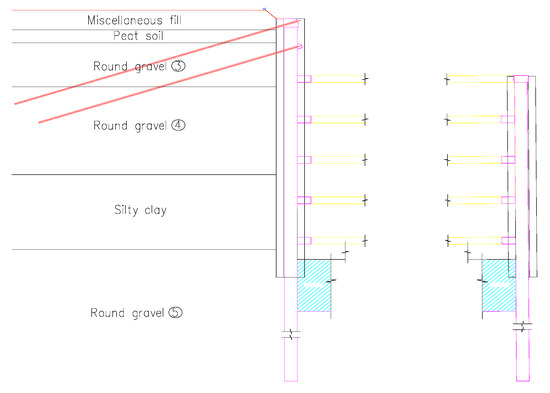 The construction project of Kunming 14th, Water Purification Plant is a fully buried underground sewage treatment plant located in Panlong District, Kunming City, Yunnan Province, at the northern end of the Kunming Dianchi faulted basin. The shape of the basin is irregular, but generally it is longer from north to south and narrower from east to west, which is consistent with the structural trend. The ground elevation is between 1901.89 and 1907.57 m, and the maximum elevation difference is about 5.68 m. As shown in Figure 9, the stratigraphic structure within the depth of the pit survey mainly consists of the Quaternary artificial accumulation (Q4ml) layer: artificial fill; the Quaternary alluvium (Q4al + pl) layer: clay, round gravel, and powder; and the Quaternary marsh phase sediment (Q4h) layer: peaty soil and organic soil. The gravels are composed of chert, sandstone, and a small amount of basalt and quartz, rounded to subrounded, with good rounding, and filled with a small amount of silt and clay between grains, with poor cementation, and locally produced with thin laminated pebbles. Round gravel ③ has a grain size of 1.0–4.0 cm, a small amount of 5.0–6.0 cm, and a gravel content of 50–70%. Round gravel ④ has a grain size of 1.0–4.0 cm, with a small amount of 5.0–6.0 cm and a gravel content of 50–60%. Round gravel ⑤ grain size 0.5 cm~4.0 cm, a small amount of 5.0~6.0 cm, gravel content about 50~60%. Round gravel ⑥ Grain size 0.5 cm–3.0 cm, a small amount of 4.0–5.0 cm, gravel content about 50–65%. Round gravel ⑦ grain size 0.5 cm~2.5 cm, a small amount of 4.0~6.0 cm, gravel content of about 50~60%. Round gravel ⑧ grain size 0.5~2.0 cm, a small amount of 3.0~4.0 cm, gravel content about 55~65%. Regionally, it belongs to the Jinsha River system and Dianchi basin, and the surface water body is more developed. The groundwater type in the site is mainly upper stagnant water and diving, and the water level burial depth is between 0.8 and 1.5 m.