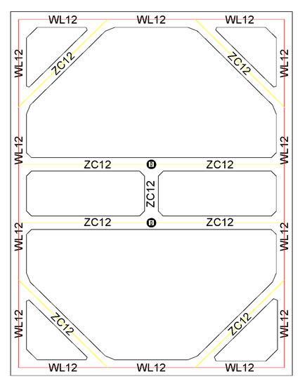 The pit covers an area of 65,800 m2, and the depth of pit support is 14~33 m. The pit is divided into four sections, one of which includes the intake pump room and aeration and sand sink. The modeling object is the intake pump room, with a design depth of 33 m, plan size of 32 m long and 25 m wide, perimeter length of 114 m, and area of 800 m2. 1200 mm diaphragm wall + reinforced concrete internal bearing and anchor cable support form is used for the enclosure structure. The wall height is 43.75 m and 67.5 m, and the width is 5.10~6.00 m, the length of the single reinforcement cage is 44.25 m and 68 m, and the depth of continuous wall embedded in the subgrade is 22.8~42.1 m according to the geological condition. As Figure 10 and Figure 11 show the section of the pit of the inlet pump room and the internal bearing structure, respectively.