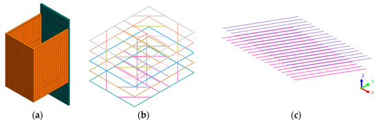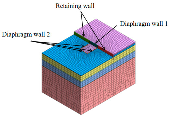 The width of the standard section of the foundation pit is 24.5 m, the length is 32.2 m, and the excavation depth is 29.4 m. the maximum length of the diaphragm wall is 70 m. The minimum length is 44 m. In order to reduce the influence of the simulated boundary conditions on the simulation process, the boundary is taken six times the excavation depth of the foundation pit. The model size is 180 m × 120 m × 120 m. as the construction depth of the diaphragm wall 2 is −8.7 m, the overall Foundation pit excavation to −8.7 m before starting into the pump room pit construction. Therefore, in this simulation pit excavation from −8.7 m to start, diaphragm wall 1 to the boundary to retaining wall simulation, calculation model as shown in Figure 12, simplification will not have a large impact on the accuracy of the calculation and the essence of the calculation. The model grid of the 3D finite element model of the foundation pit is mixed, the total number of cells of the overall foundation pit model is 77,202, and the total number of nodes is 47,899. The calculation uses displacement boundary conditions; in the left and right boundaries of the model, the displacement in the X direction is fixed, and in the front and back boundaries of the model, the displacement in the Y direction is fixed. Moreover, at the bottom of the model, the displacement in three directions is fixed. In the modeling process, the soil and diaphragm wall are simulated by solid units, the internal bearing and lattice columns are simulated by beam units, and implanted trusses simulate the prestressed anchor cables. Figure 13 shows the schematic diagram of the calculation model of the foundation support structure of the intake pump room. As shown in Figure 13, the diaphragm wall, internal bearing, and anchor cable together form the foundation support system. The three arrangements in the calculation model are shown in Figure 10.
