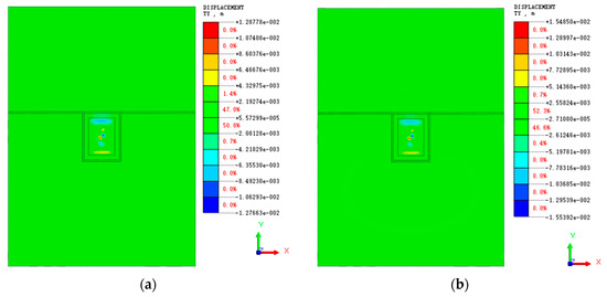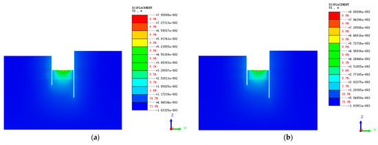 Vertical displacement cloud of diaphragm wall: (a) natural moisture content shear strength parameters; (b) saturated moisture content shear strength parameters.