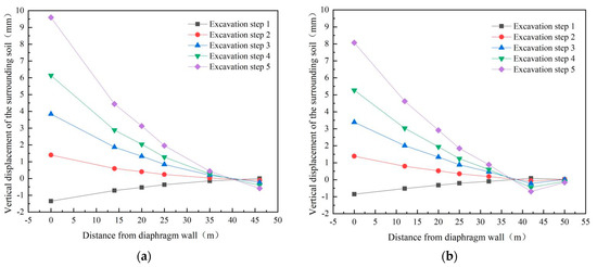 Since the surface vertical displacement variation pattern under the conditions of two shear strength parameters of round gravel soil is consistent, the displacement variation curve under the conditions of natural shear strength parameters of round gravel soil is selected for analysis in this study, as shown in Figure 15. As can be seen from Figure 15, the soil at the edge of the foundation pit sinks after the end of excavation step 1. With the increased distance from the diaphragm wall, the sinking of the surrounding surface gradually decreases. The surrounding surface starts to rise outside the range of 40 m from the diaphragm wall. Furthermore, the soil around the foundation pit within 40 m is uplifted in the second step of excavation to the end. With the increase of excavation depth, the soil uplift around the foundation pit gradually increases. From the end of excavation step 2 to the end of the excavation, the uplift of the surrounding surface soil gradually decreases with the increase of distance from the diaphragm wall, and the decrease rate gradually increases with the increase of excavation depth. The main reason for the bulging of the soil around the foundation pit is that the foundation pit is excavated deeper, and the self-weight of the original soil is unloaded rapidly, so the bulging of the foundation is larger and drives the bulging of the surrounding surface soil.