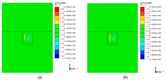 Figure 16 and Figure 17 show the displacement clouds of the surface and the soil at the bottom of the pit in X and Y directions around the end of the foundation pit excavation under natural and saturated shear strength parameters of round gravel soil, respectively. From Figure 16, it can be seen that after the end of the pit excavation, the soil’s horizontal displacement at the pit bottom is locally larger, which is located on both sides of the lattice column, respectively. The maximum horizontal displacement is 15.7 mm, mainly due to the combined effect of the lattice column and excavation unloading. Affected by the reinforcement area of the pit bottom, the horizontal displacement of the pit bottom soil is slightly larger at the edge of the long side but smaller than the two sides of the lattice column. The horizontal displacement of the soil body under the saturated shear strength parameter of round gravel soil is slightly larger than that under natural conditions; the maximum is 17.7 mm.