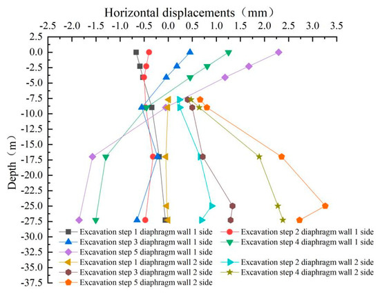 The horizontal displacement change curve under the natural shear strength parameter of round gravel soil is selected for analysis in this study, as shown in Figure 18. The midpoint of the foundation pit edge on the short side of diaphragm wall 1 and diaphragm wall 2 is taken as the monitoring point. As seen from the figure, during the first two excavation steps, the soil body on the side of diaphragm wall 1 is displaced into the pit. The horizontal displacement gradually decreases with the increase of burial depth. As the excavation progresses, the horizontal displacement gradually changes to the displacement outside the pit. Since the pit excavation unloads, the lower soil body extrudes the diaphragm wall to the pit so that the diaphragm wall above the initial excavation surface shows a trend of outward displacement, and the soil body is then displaced. Diaphragm wall 2 is displaced to the foundation pit’s inner side, with the burial depth increasing gradually; the curve at −25 m appears to turn, mainly by the influence of stratigraphic changes.