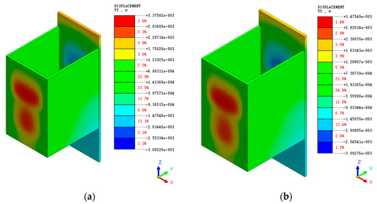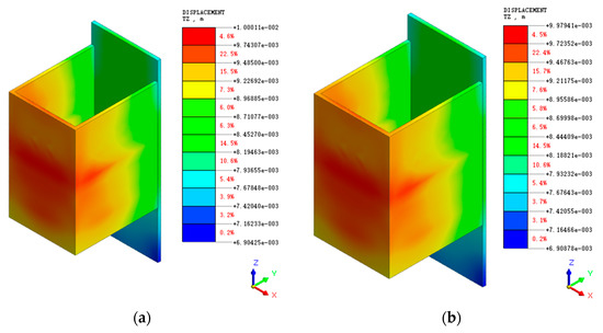 Horizontal displacement cloud in X-direction of diaphragm wall: (a) natural moisture content shear strength parameters; (b) saturated moisture content shear strength parameters.