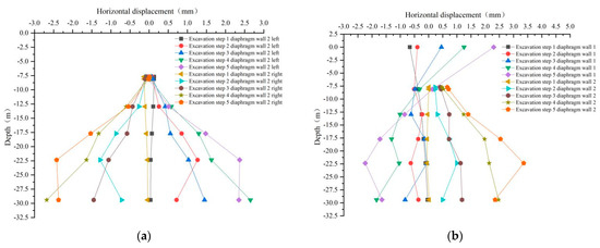 Horizontal displacement variation curve of diaphragm wall: (a) horizontal displacement in X direction; (b) horizontal displacement in Y direction.