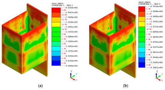 Minimum principal stress cloud of diaphragm wall: (a) natural moisture content shear strength parameters; (b) saturated moisture content shear strength parameters.