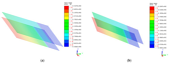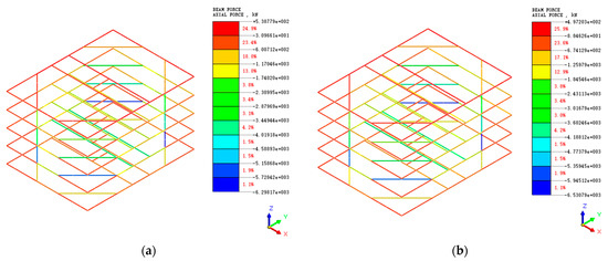 Axial force cloud diagram of interior bearing system: (a) natural moisture content shear strength parameters; (b) saturated moisture content shear strength parameters.