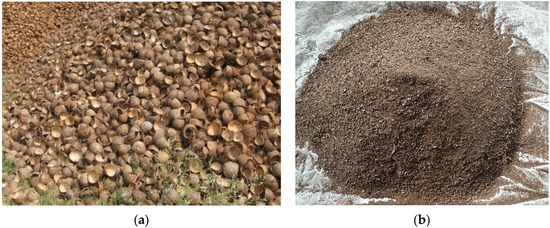 (a) Raw coconut shells and (b) coconut husk.