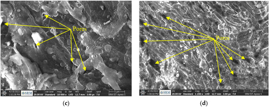 As per the SEM images in Figure 3a (OPC), Figure 3b (river sand), and Figure 3c,d (coconut husk), in general, the black spots are considered pores present in the respective materials. When comparing coconut husk aggregate to river sand, it can be noticed that some pores are present, which causes an increase in the water absorption capacity of the coconut husk when compared with river sand.