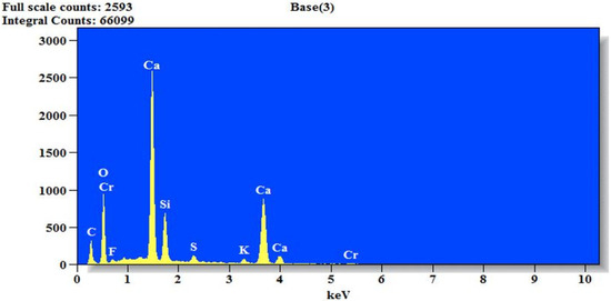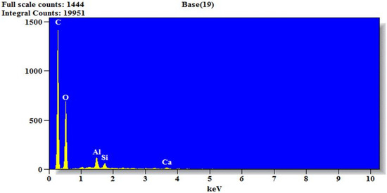 The EDX analysis of OPC, river sand, and coconut husk is shown in Figure 4, Figure 5 and Figure 6. River sand and coconut husk are passive materials in general, and their chemical components are generally inactive, except in rare situations; thus, this study is not concentrated on the influence of chemical components in river sand and coconut husk on the production of mortar. Coconut husk is composed of cellulose, semi-cellulose, and lignin molecules in general. Carbon, hydrogen, and oxygen particles make up the molecules of cellulose, semi-cellulose, and lignin. Apart from hydrogen, helium, and lithium, EDX can identify all the stable elements.