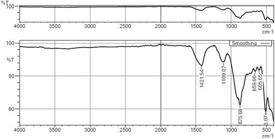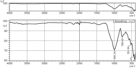 The XRD analyses crystalline powdered specimens by exposing them to X-ray beams of suitable energy. A 2θ angle ranging from 10° to 90° was used for OPC, river sand, and coconut husk, as shown in Figure 7, Figure 8 and Figure 9. Patterns of pure phases of Bogue components were evaluated in OPC; in river sand, high silica and alumina patterns were observed, and the coconut husk was found to have a high amount of carbon [50]. An FTIR analysis of OPC, river sand, and coconut husk are shown in Figure 10, Figure 11 and Figure 12, respectively. In place of a molecular fingerprint of the substances examined, the FTIR signal is given as a band extending from 4000 to 400 cm−1. As each molecule structure produces a sole spectral fingerprint, FTIR analysis is an exceptional tool for identification of chemicals. FTIR patterns wavelengths of OPC, river sand, and coconut husk, such as the bands at 875.68 cm−1, 993.34 cm−1, and 3340.71 cm−1 are found in the analysis. It can also be seen that all samples have peaked between 4000 to 500 cm−1, implying that these materials have different bonds [51].