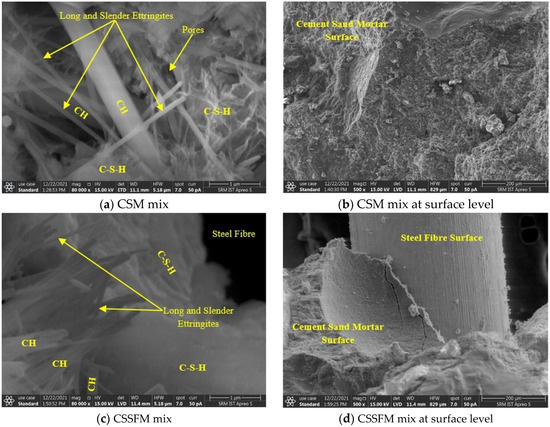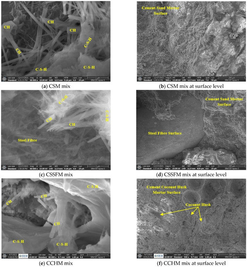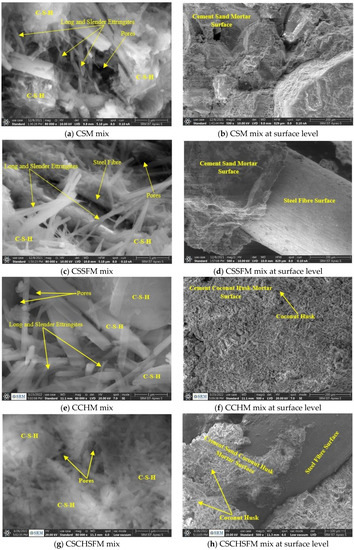 This study aimed to investigate the microstructural qualities of cement and mortar, as well as the hydration mechanisms responsible for the internal microstructures. Because the hydration process begins with the addition of water to the cement, it needs to keep track of the hydration and, as a result, the microstructures. Therefore, 0, 1, 3, 7, and 28 days were selected as the ages of the observation days on the CSM, CSSFM, CCHM, and CSCHSFM mortar mixes to verify the development of key long and thin ettringite, aggregation of fibrous crystals and clusters, and a reticular system of C-S-H.