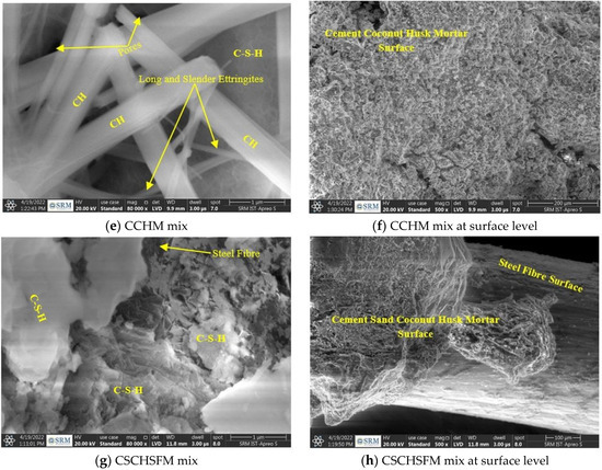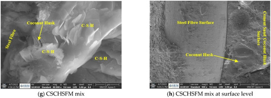 Generally, the morphology of C-S-H phase development ranges from weakly crystalline fibres to clusters and reticular networks. When an OPC paste is entirely hydrated, network clusters of C-S-H account for 50–60% of the volume of the solids, which is the most important phase that dictates the paste qualities. Because it only shows clusters and reticular networks and nil ettringite, the C-S-H phase is created in practically the whole area of the images displayed in Figure 17 in this study. All these images (Figure 13, Figure 14, Figure 15, Figure 16 and Figure 17) reveal that river sand and coconut husk-containing mixes undergo a systematic hydration process. As a result, the standard cement hydration process is unaffected by substituting coconut husk for river sand.