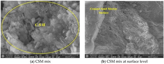 The Ca:Si ratio is larger in the early days and decreases with age, as seen in Table 4. At 28 days, the Ca:Si ratio for all mixes is between 1.0 and 2.5, with CSM and CCHM demonstrating a higher Ca:Si ratio than CSSFM and CSCHSFM, emphasising that the methodical hydration process happens in both river sand and coconut husk containing mixes.